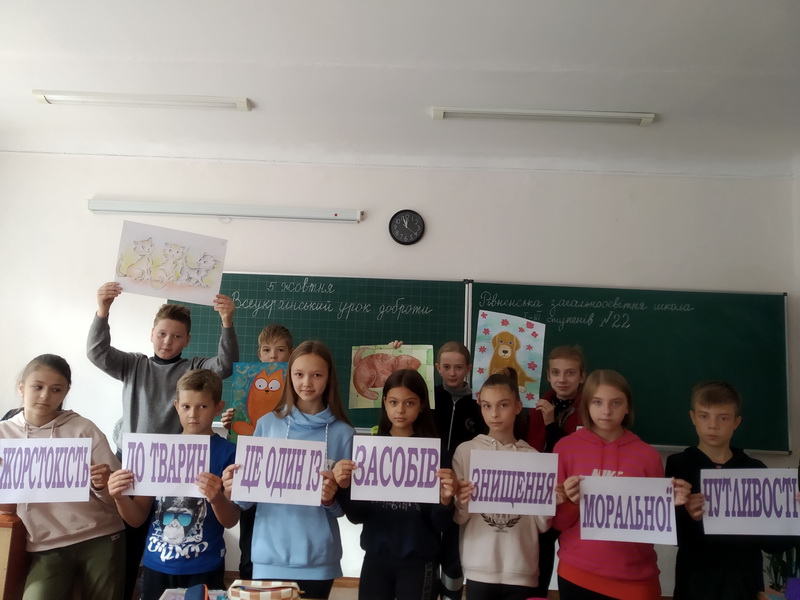5-6 жовтня 2020 р. з метою покращення ситуації безвідповідального та жорстокого ставлення до тварин та з метою реалізації статті 6 Закону України «Про захист тварин від жорстокого поводження» у ЗОШ№22 був проведений урок доброти, у якому взяли участь 22 класні колективи. Ініціатором проведення у закладах загальної середньої та професійної освіти «ІІІ Всеукраїнського уроку доброти» є Благодійний фонд «Щаслива лапа». На занятті учні переглянули презентації, мультфільми про братів наших менших, розповіли зворушливі історії про тварин, які потребують нашої допомоги та про своїх домашніх улюбленців, з радістю демонстрували їх фото та малюнки, Діти ще раз переконалися в тому, що відповідальне ставлення до тварин, робить наш світ кращим.