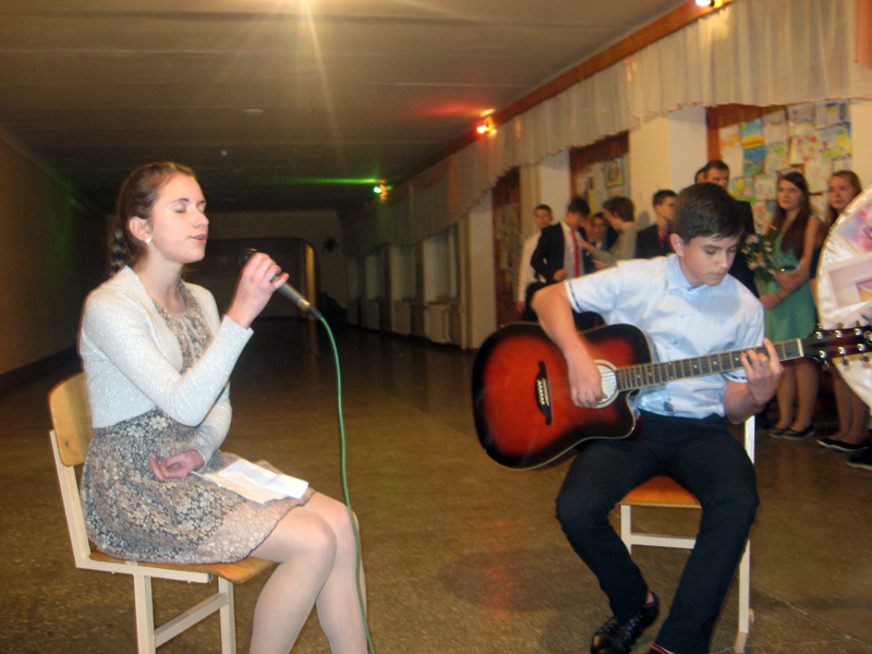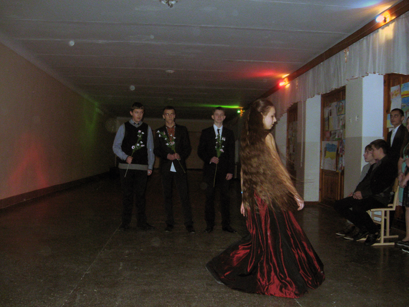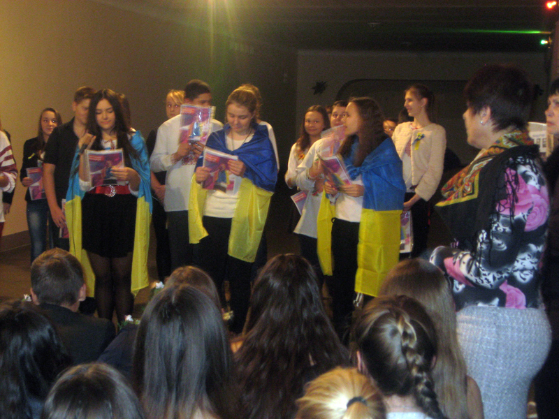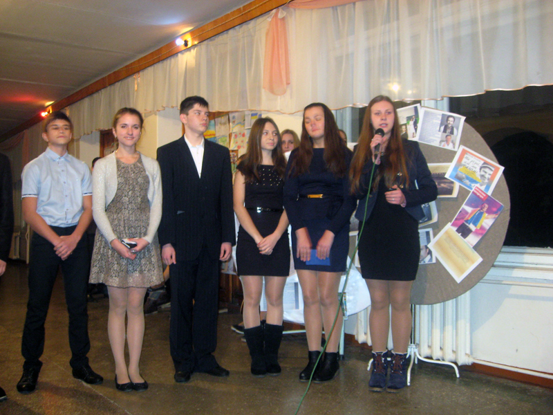 Учні 8-А класу нагадали присутнім про річницю Майдану, про події, які відбулися в нашій країні за рік: «У цей нелегкий для нашої країни час, не можна було б не згадати про Схід, який стікає і плаче червоними слізьми. Наш клас всіма можливостями допомагає військовим, які борються за нас. Ми віримо, що все буде добре», як сказано у пісні «Океану Ельзи», лідером якого є Святослав Вакарчук».