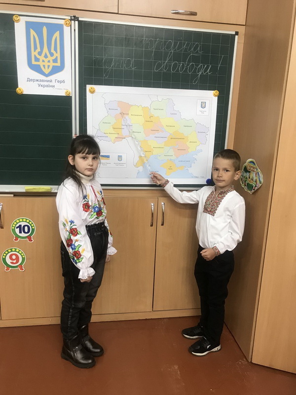 Учні початкової школи висловлювали побажання своїй Батьківщині, заповнюючи карту «Я бажаю Україні…»: миру, процвітання, свободи, перемог, мужності, згуртованості, стійкості, стабільності, потужного розвитку – люблю Україну всім серцем своїм!