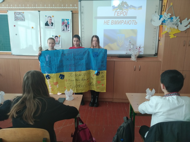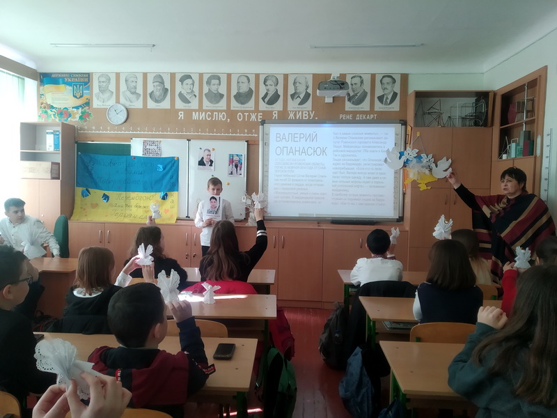 Учні зворушливо пригадували події, що відбувалися на майдані Незалежності 18-20 лютого 2014 року, заспівали пісні, які лунали під час Революції Гідності, створили «Алею ангелів». З хвилюванням діти обговорювали військові події, які відбуваються на Сході України, учасниками яких були батьки учнів класу.