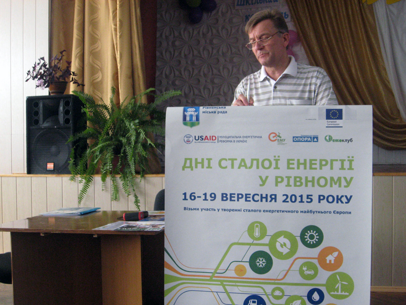 А 18 вересня за сприяння ПрАТ «ЕСКО-РІВНЕ» у нашій школі відбувся семінар «Енергозбереження в моїй домівці». Проблему збереження енергії учні обговорювали з кандидатом технічних наук, доцентом кафедри гідроенергетики, теплоенергетики та гідравліки машин НУВГП Карпюком Анатолієм Андрійовичем.