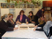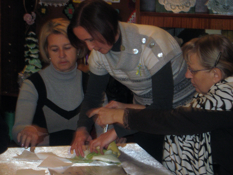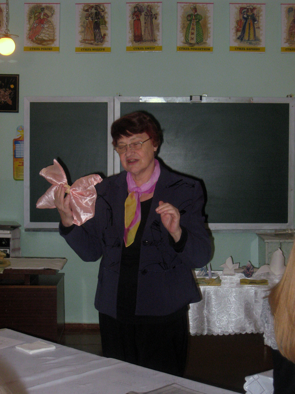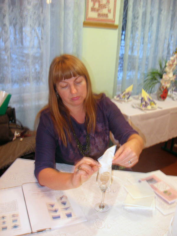 - Техніка складання серветки (вч. вищої категорії, вчитель-методист Гвоздюк О. А.). Провела практичну роботу в групах, навчаючи колег 12- ьом технікам складання серветки. Підготувала інструкційні картки з усіма техніками. Поділилися досвідом і колеги зі шкіл міста.