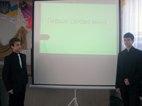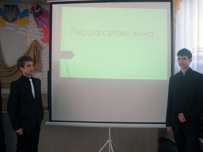 В ході виступів учнів 10-А класу розкрито головні події в історії людства: підсумки Першої світової війни, 100-річчя з початку якої відзначало прогресивне людство планети, 70-річчя визволення України від фашистських загарбників, наслідки Другої світової війни.