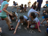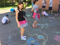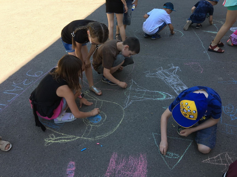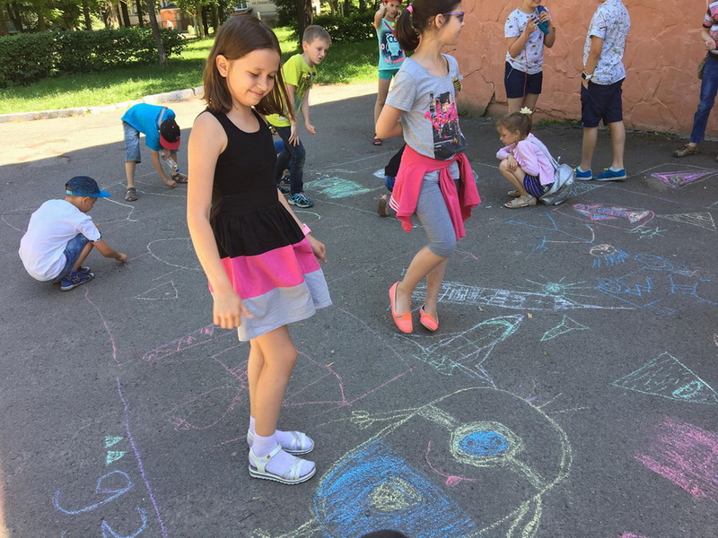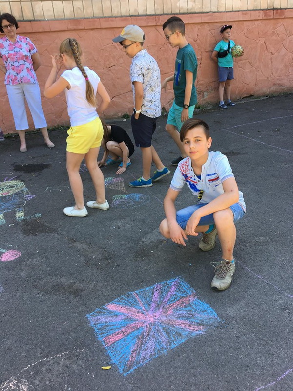 English learners painted cartoon’s heroes on the asphalt. Учні малювали героїв з мультфільмів на асфальті.